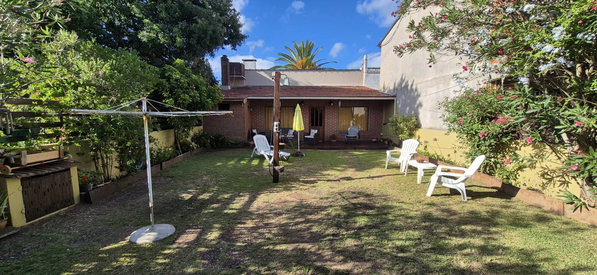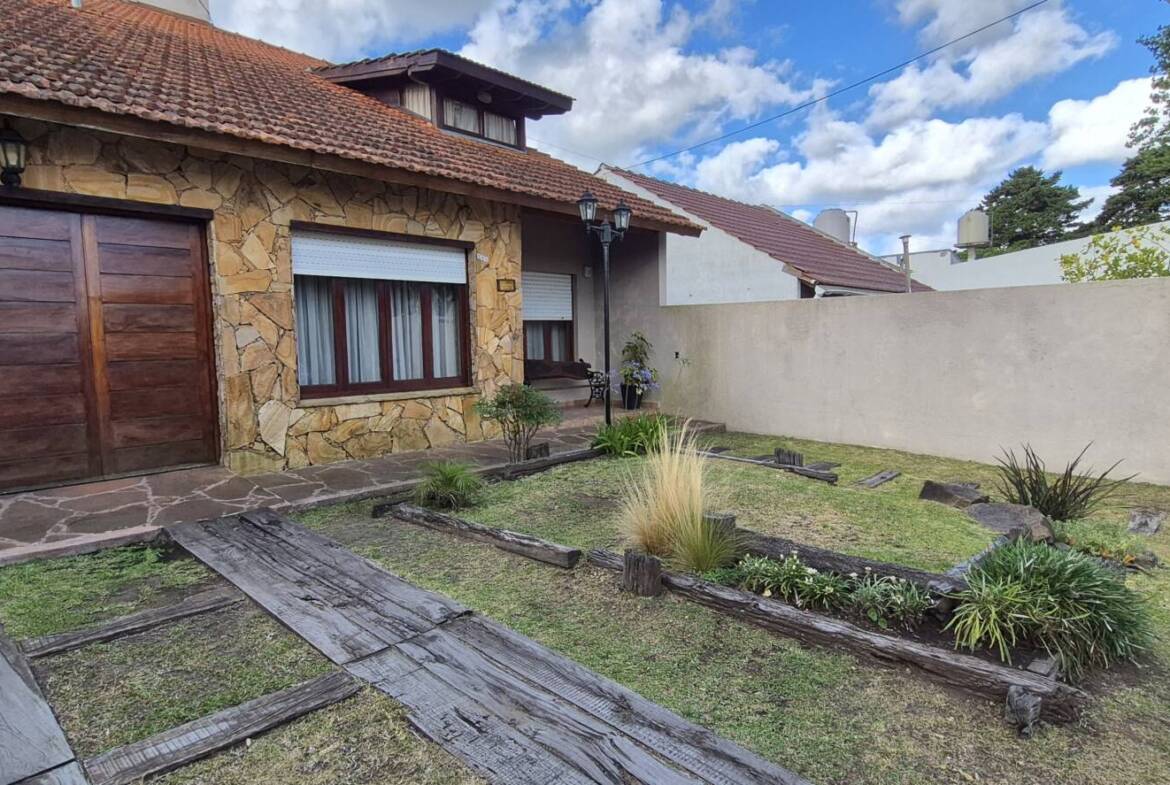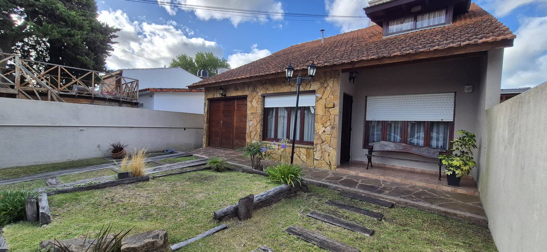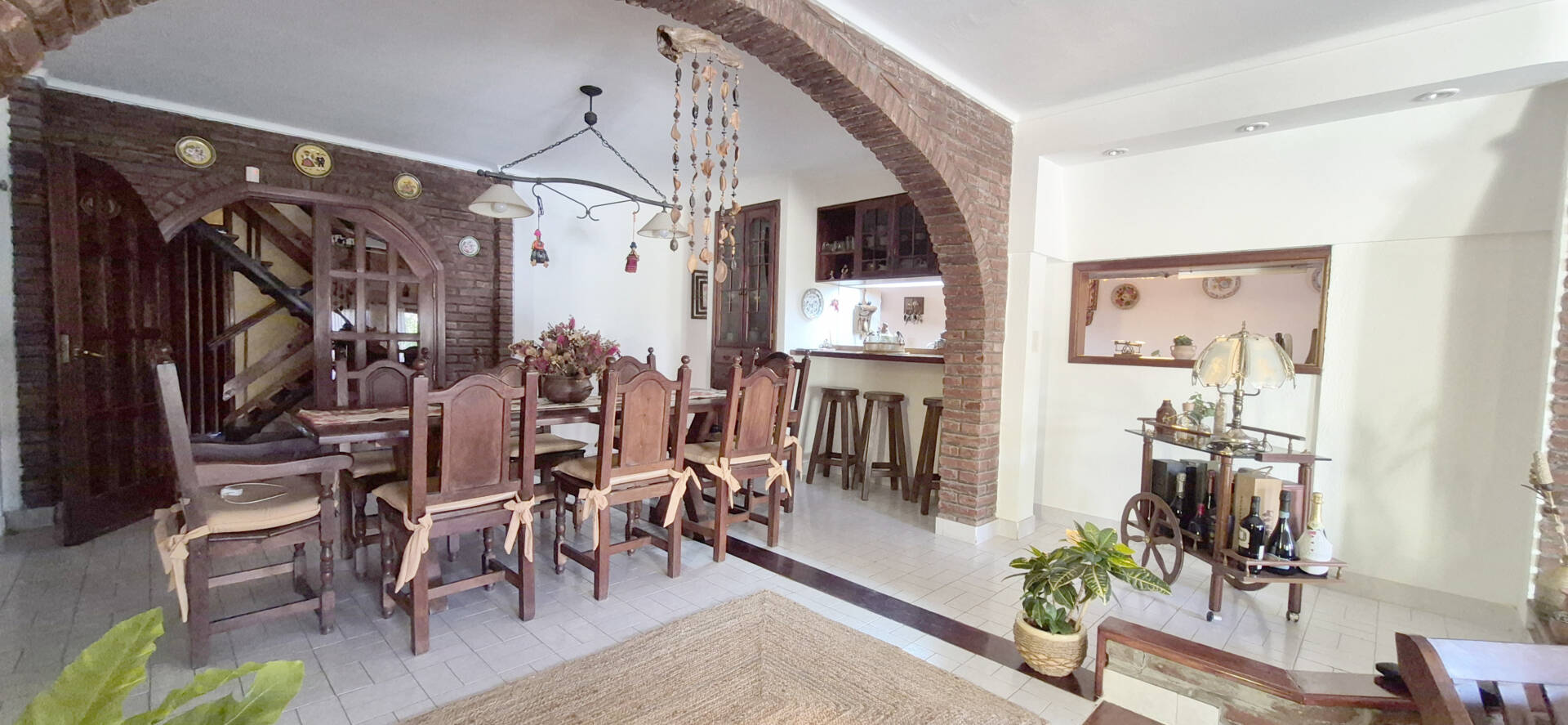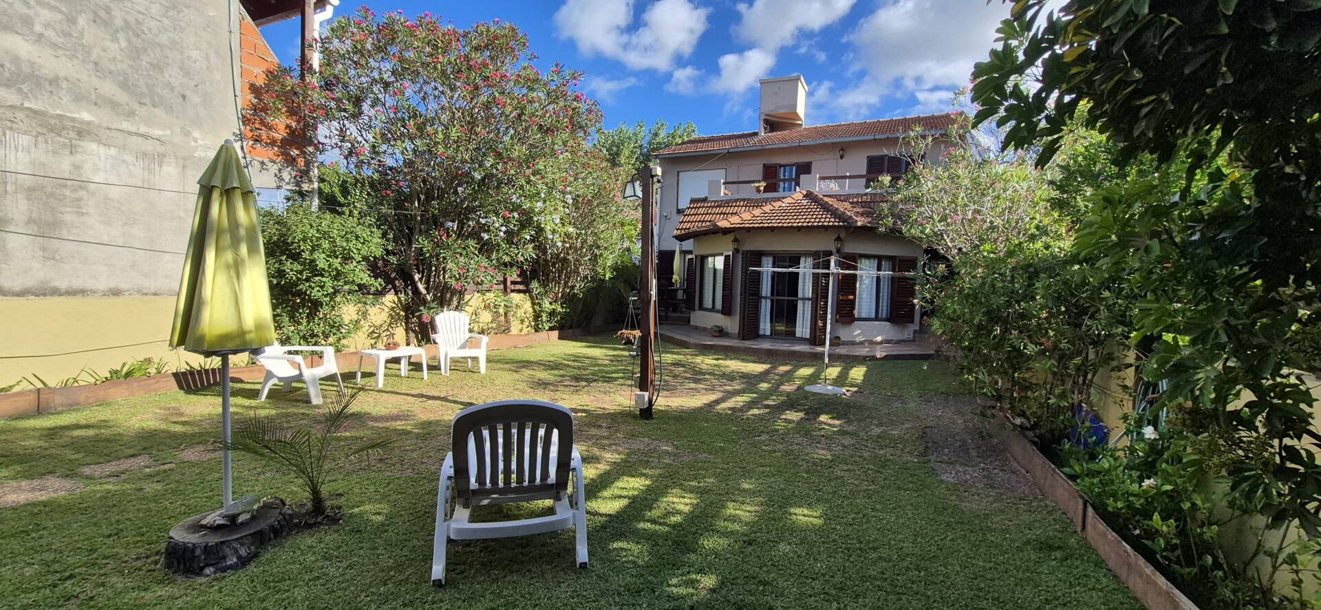Casa desarrollada sobre una superficie total de 440 m², con 220 m² cubiertos, ubicada en un entorno residencial consolidado. La propiedad cuenta con un diseño tradicional, destacando materiales como ladrillo y madera en sus terminaciones exteriores e interiores. El frente presenta un jardín con senderos y espacios verdes, mientras que el fondo ofrece un amplio patio con áreas de descanso y vegetación, ideal para actividades al aire libre.