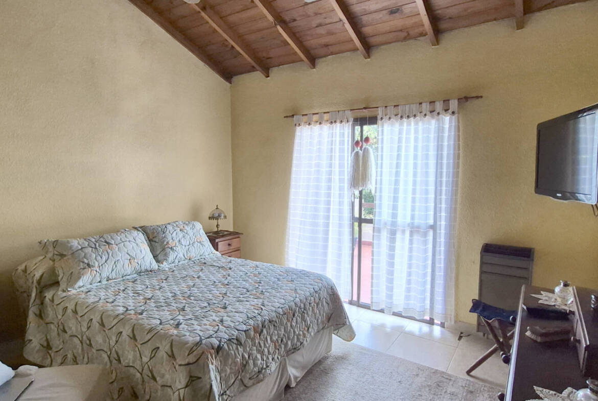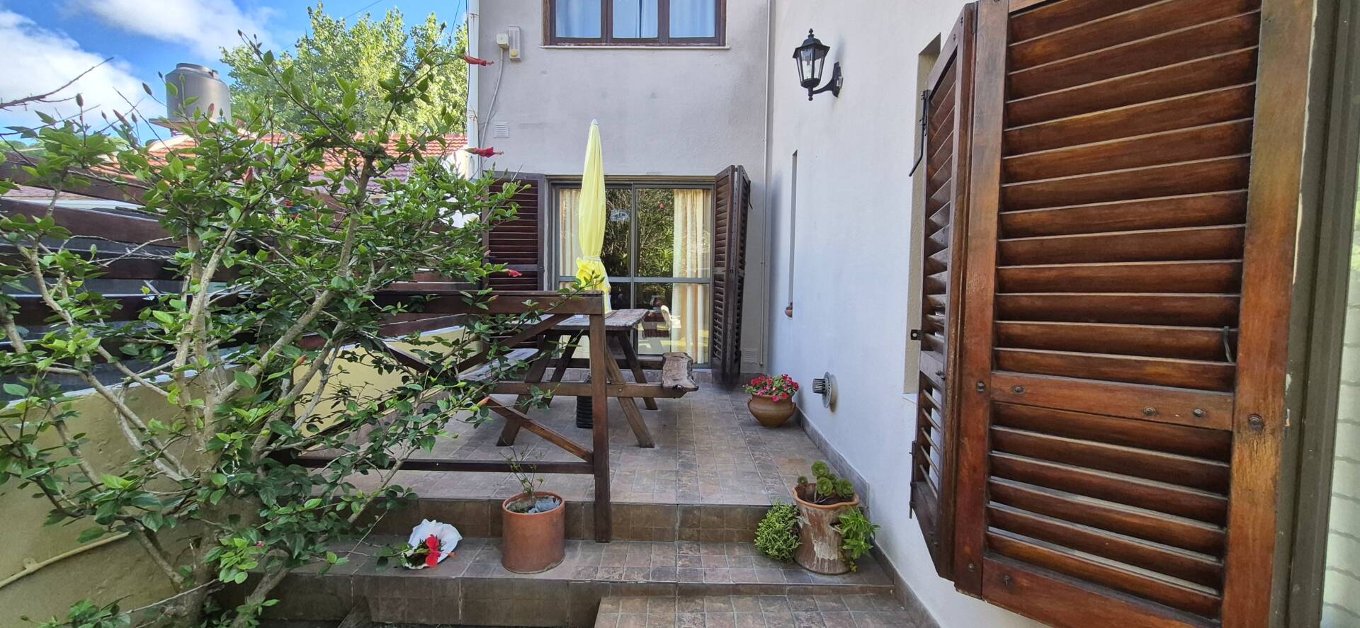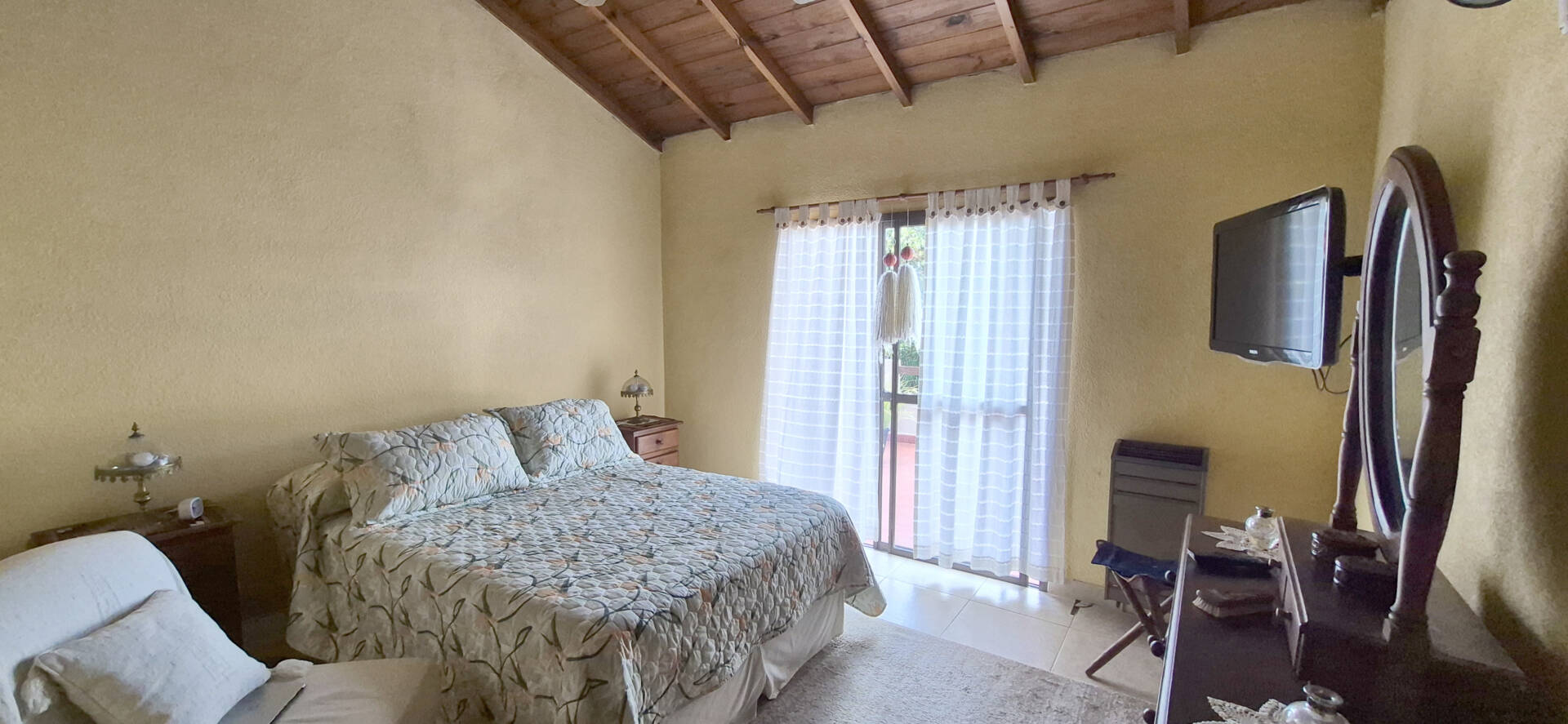 En el interior, la casa dispone de cuatro dormitorios y tres baños, distribuidos en ambientes funcionales. El living y comedor se integran en un espacio principal, con acceso directo al jardín y detalles en madera en techos y aberturas. La cocina está equipada y se conecta con el comedor diario, permitiendo una circulación fluida entre los ambientes. Además, la propiedad incluye una baulera, brindando espacio adicional de almacenamiento.